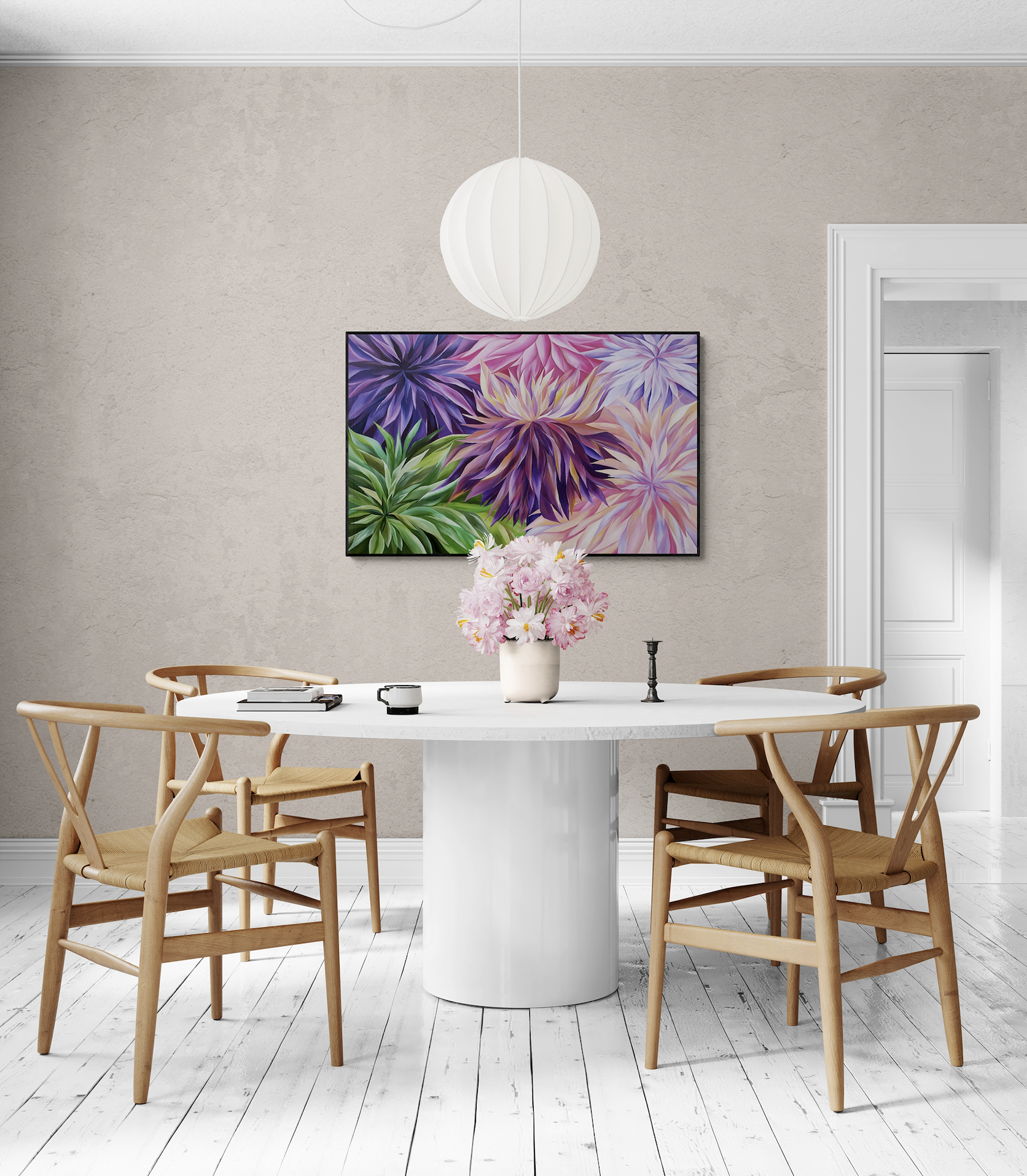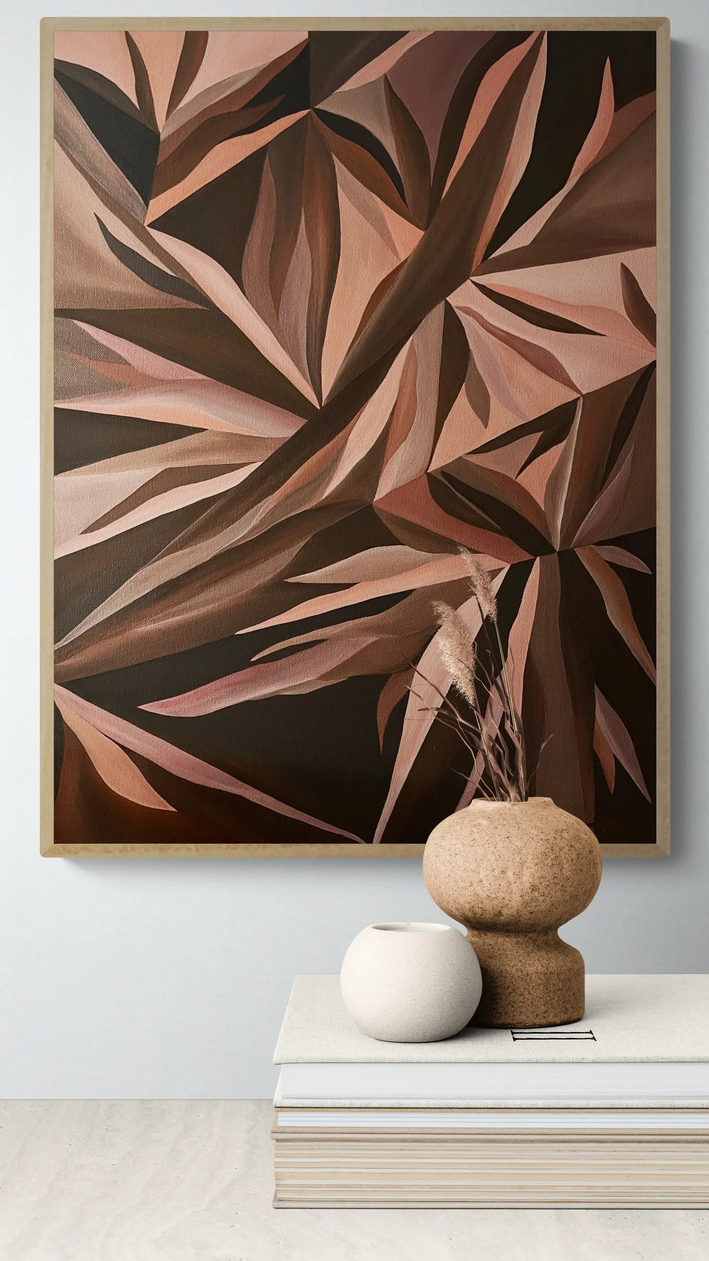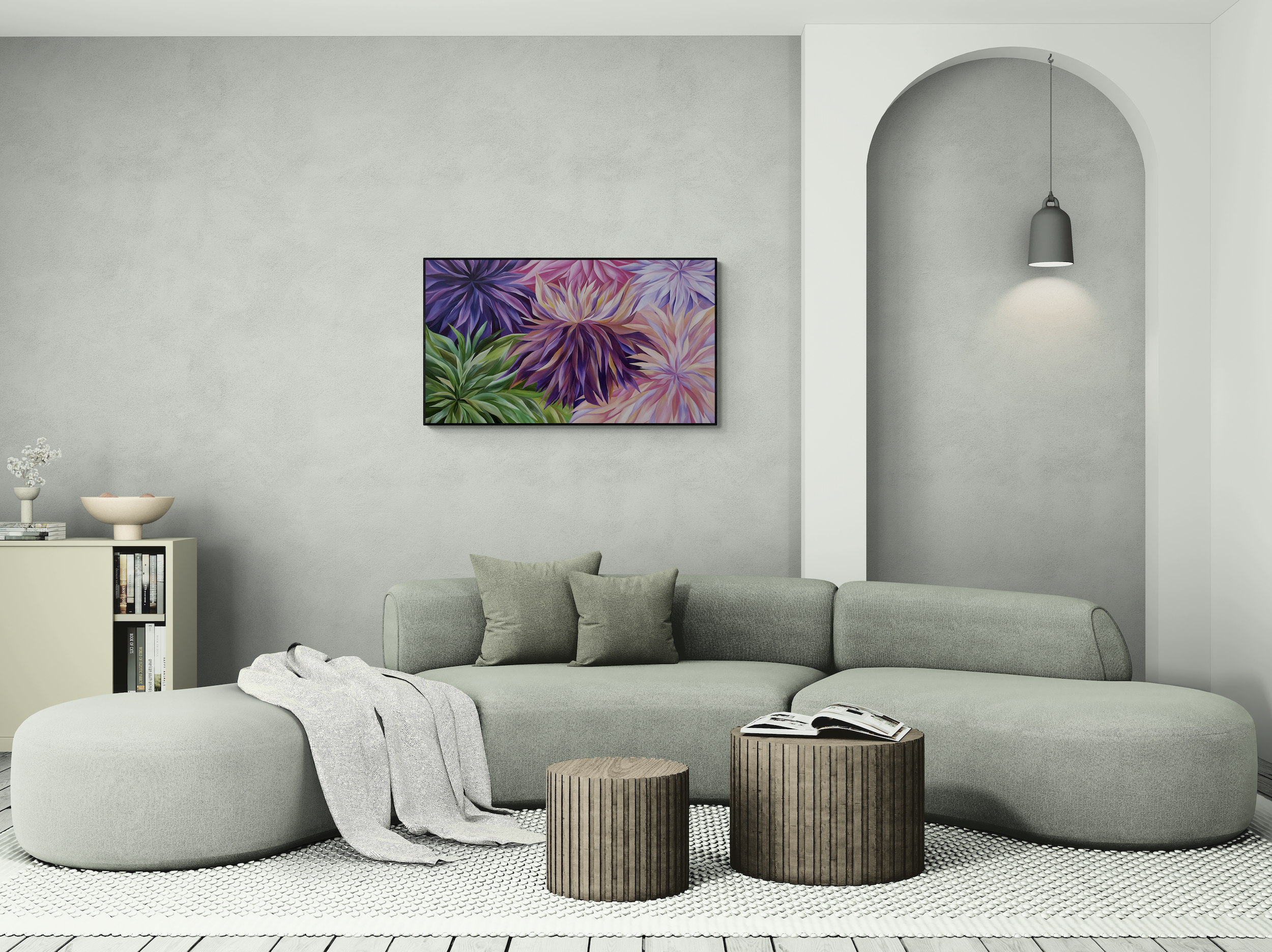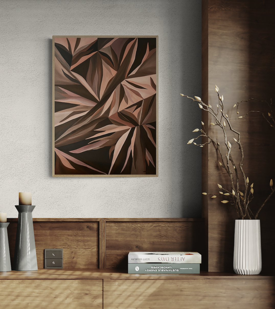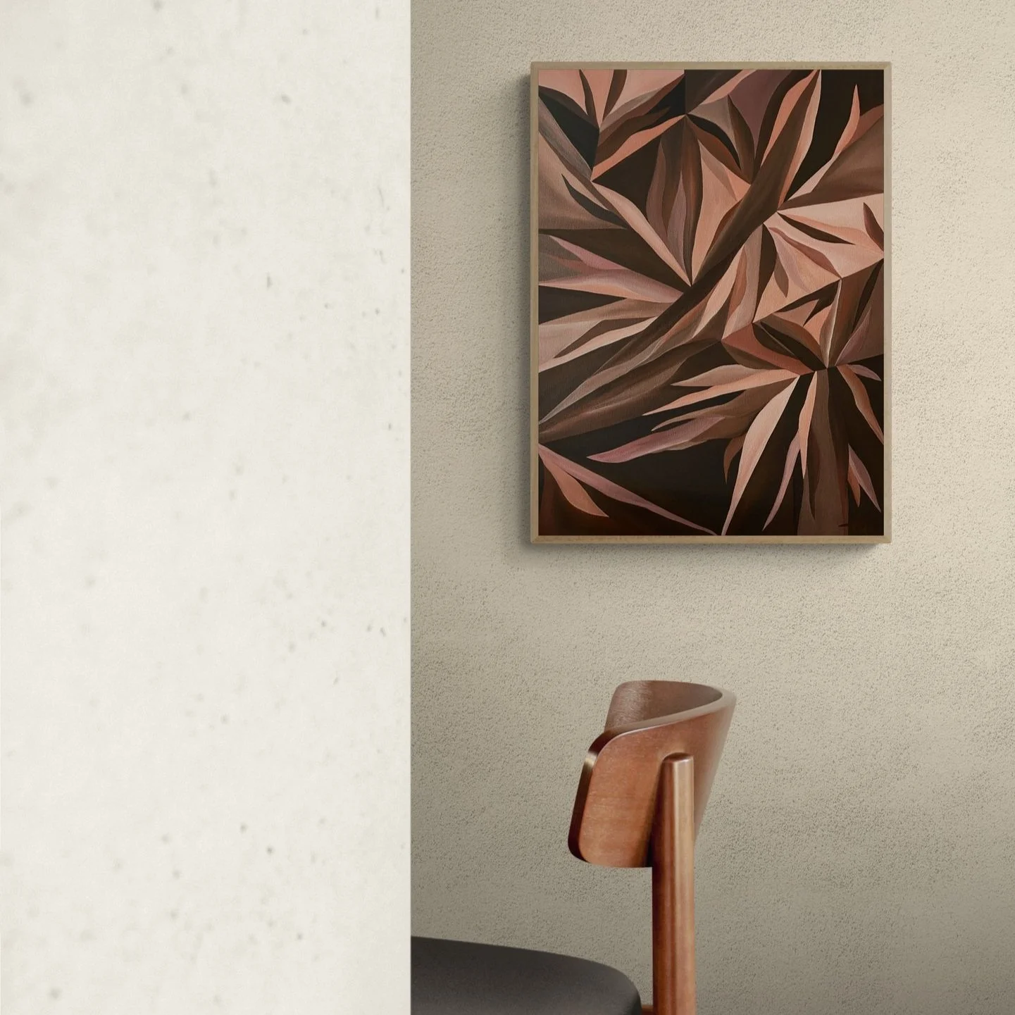Her current works, showcase bold florals contrasted with geometric balance, resulting in artworks that feel both intuitive and intentional. Rich colour palettes, textured brushwork, and clean lines come together to create striking wall art that enhances modern interiors and offers a sense of calm, harmony, and visual interest.