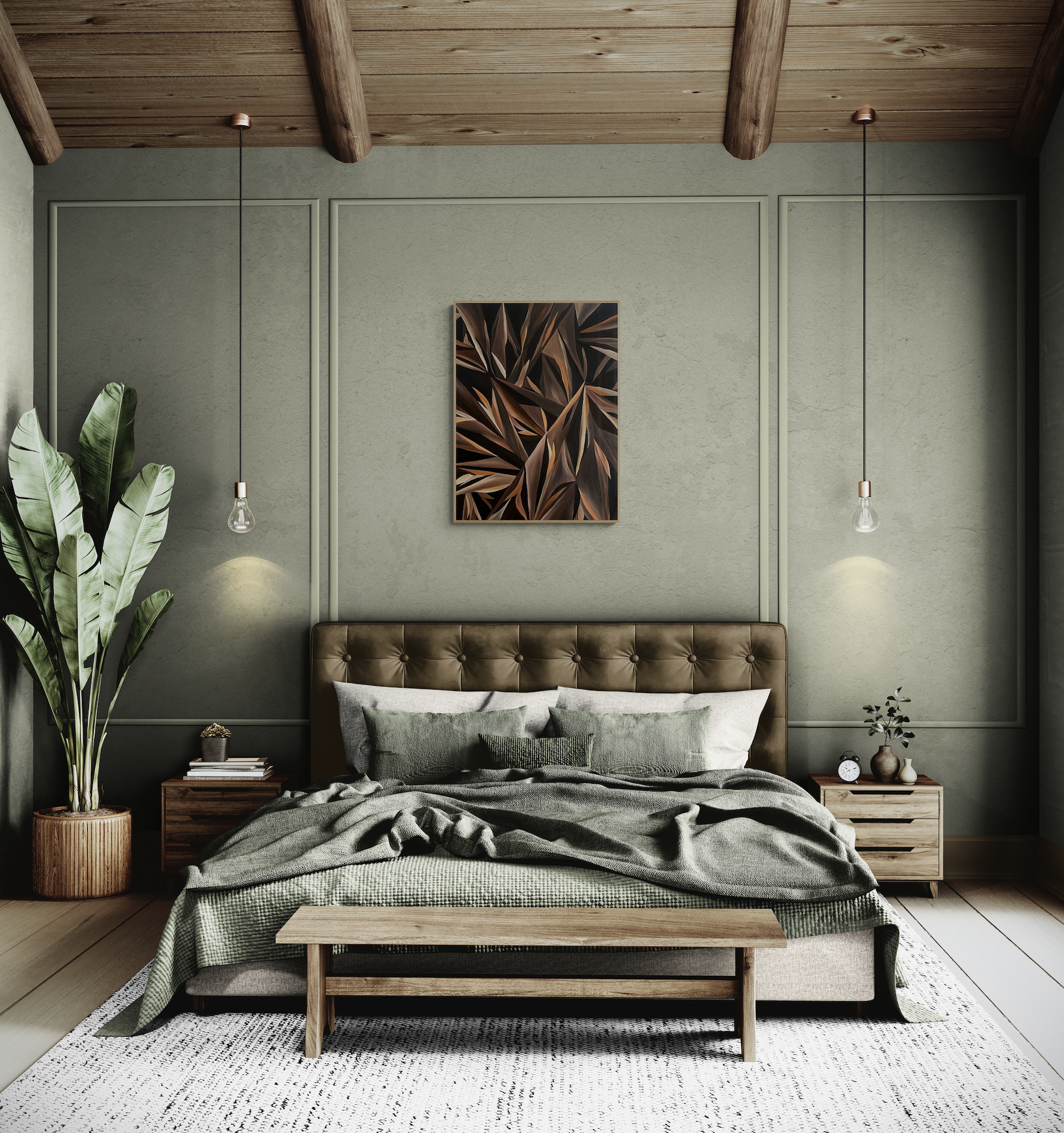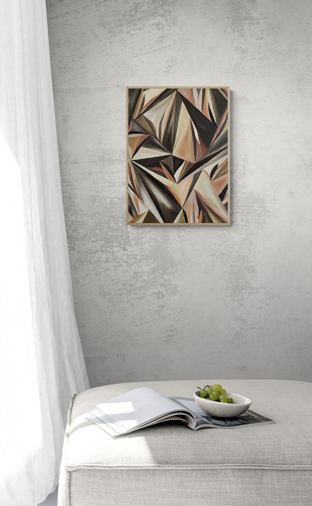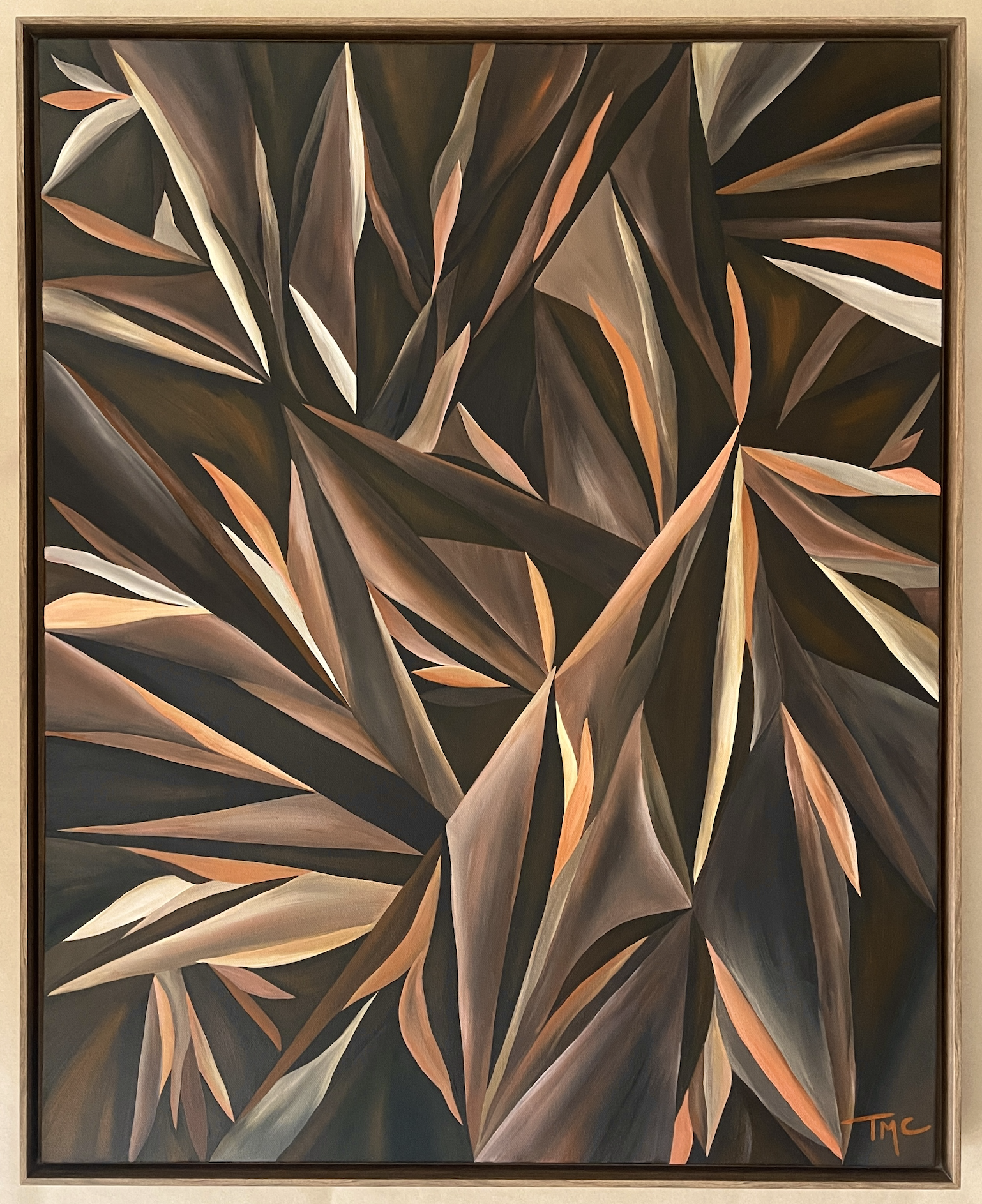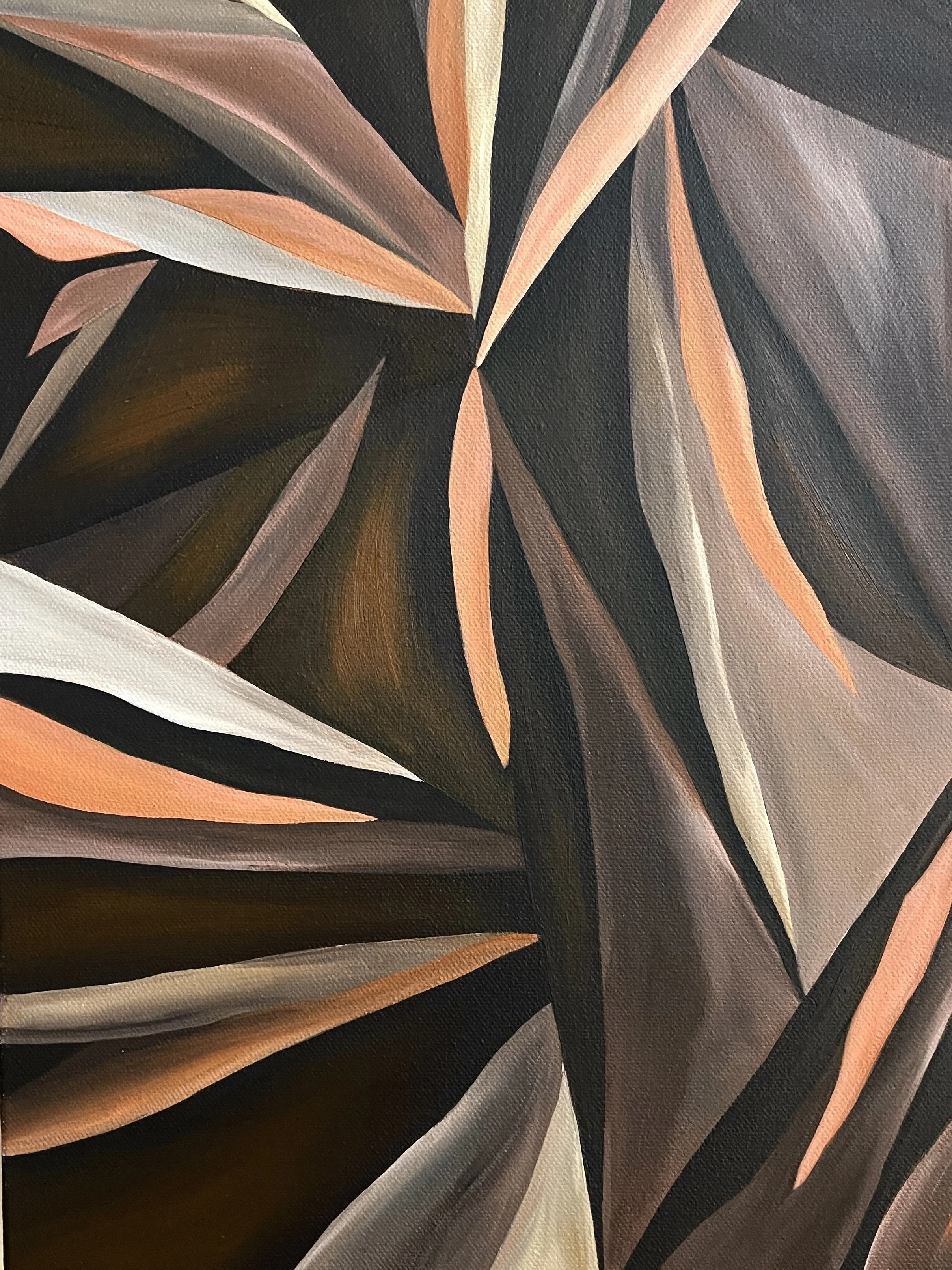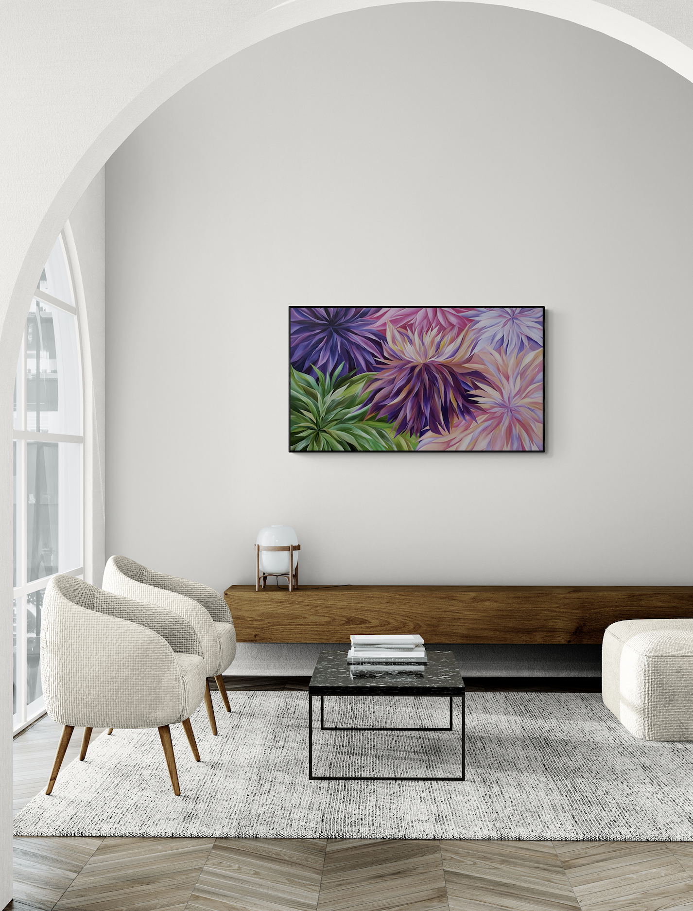 Her current works, showcase bold florals contrasted with geometric balance, resulting in artworks that feel both intuitive and intentional. Rich colour palettes, textured brushwork, and clean lines come together to create striking wall art that enhances modern interiors and offers a sense of calm, harmony, and visual interest.