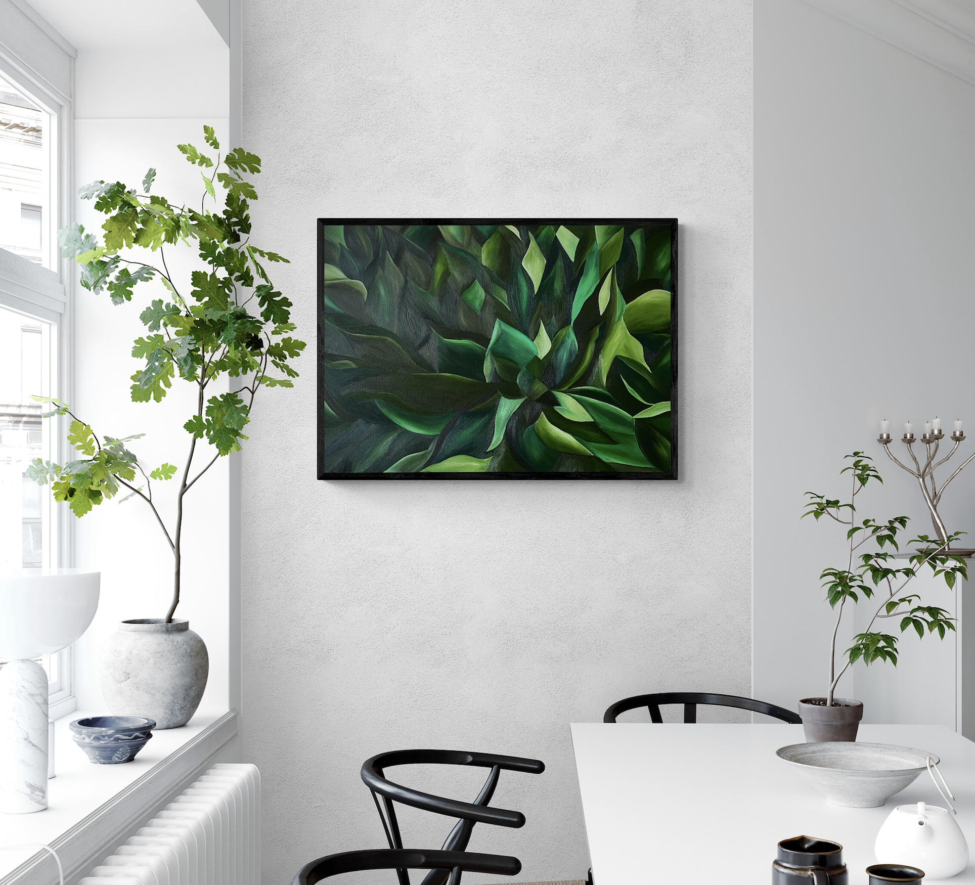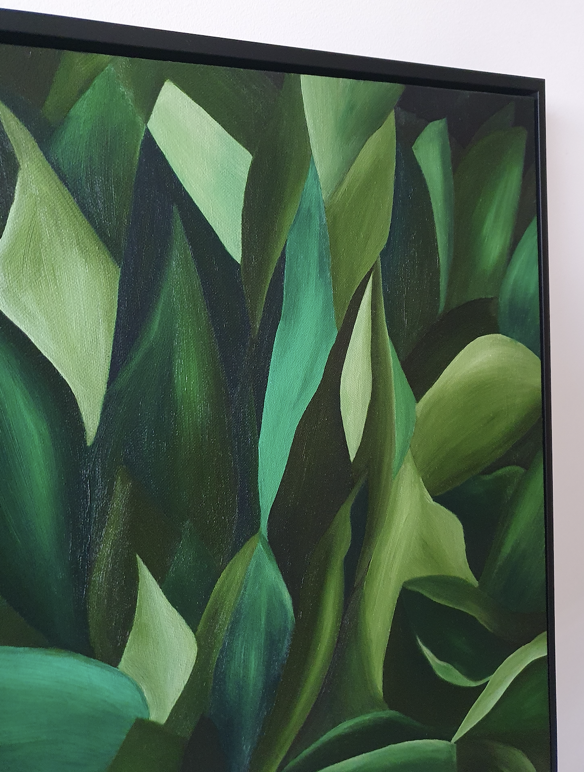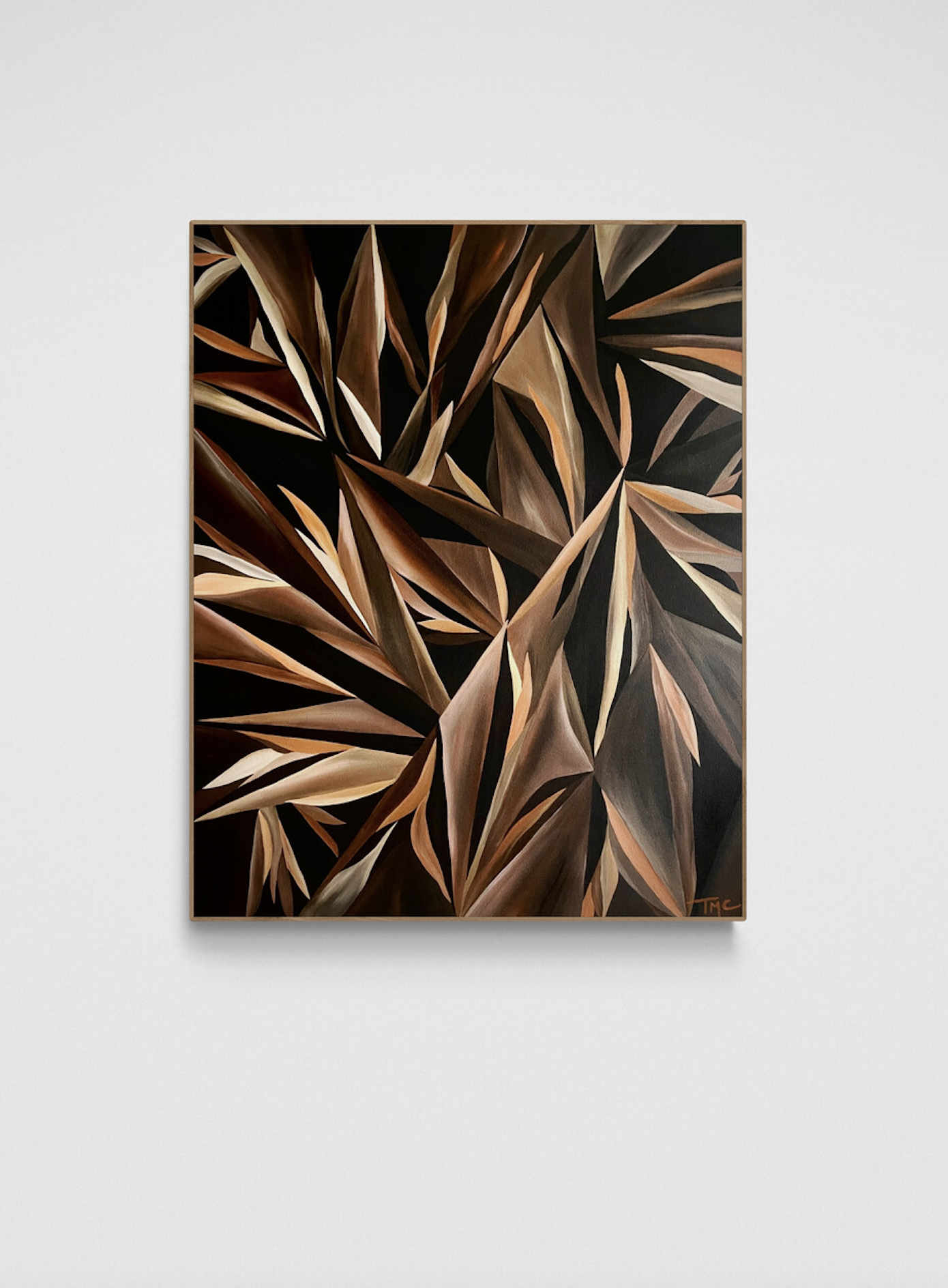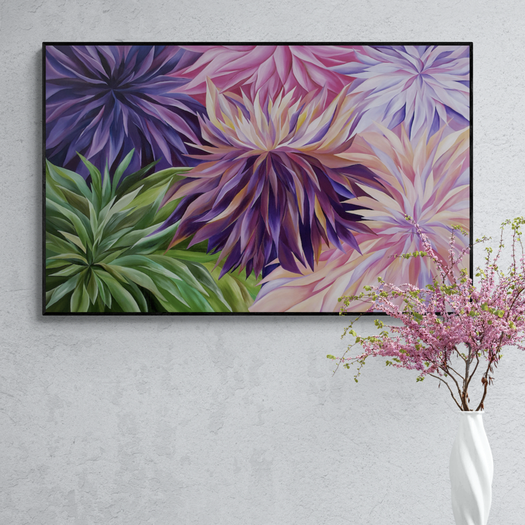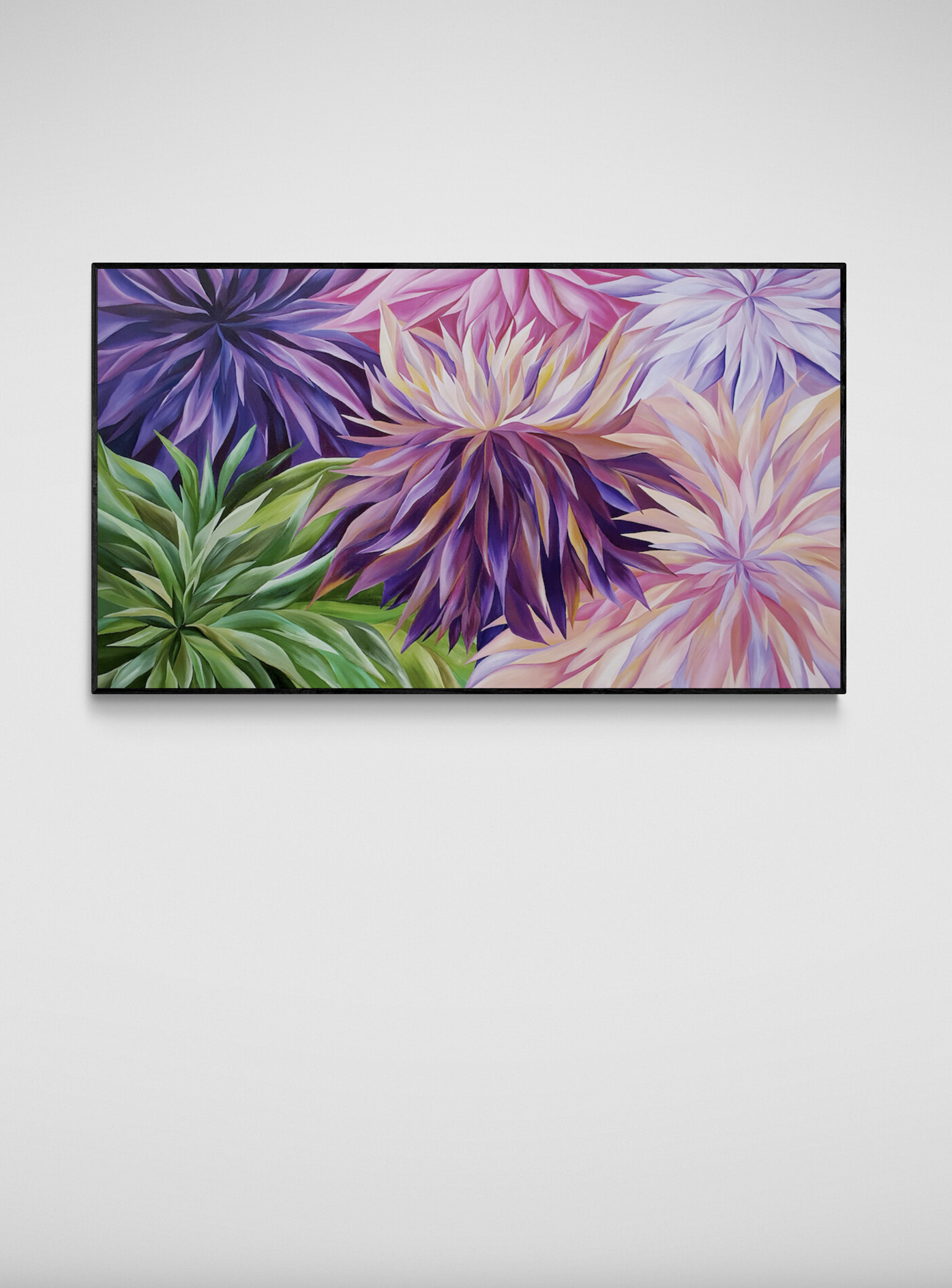 Working primarily in oils, she builds layered compositions where botanical elements unfold against circles, grids, arcs, and subtle geometric patterns. This signature fusion of florals and geometry creates a modern, recognisable aesthetic that appeals to collectors, interior designers, and contemporary art lovers seeking pieces that bring both life and structure into a space.