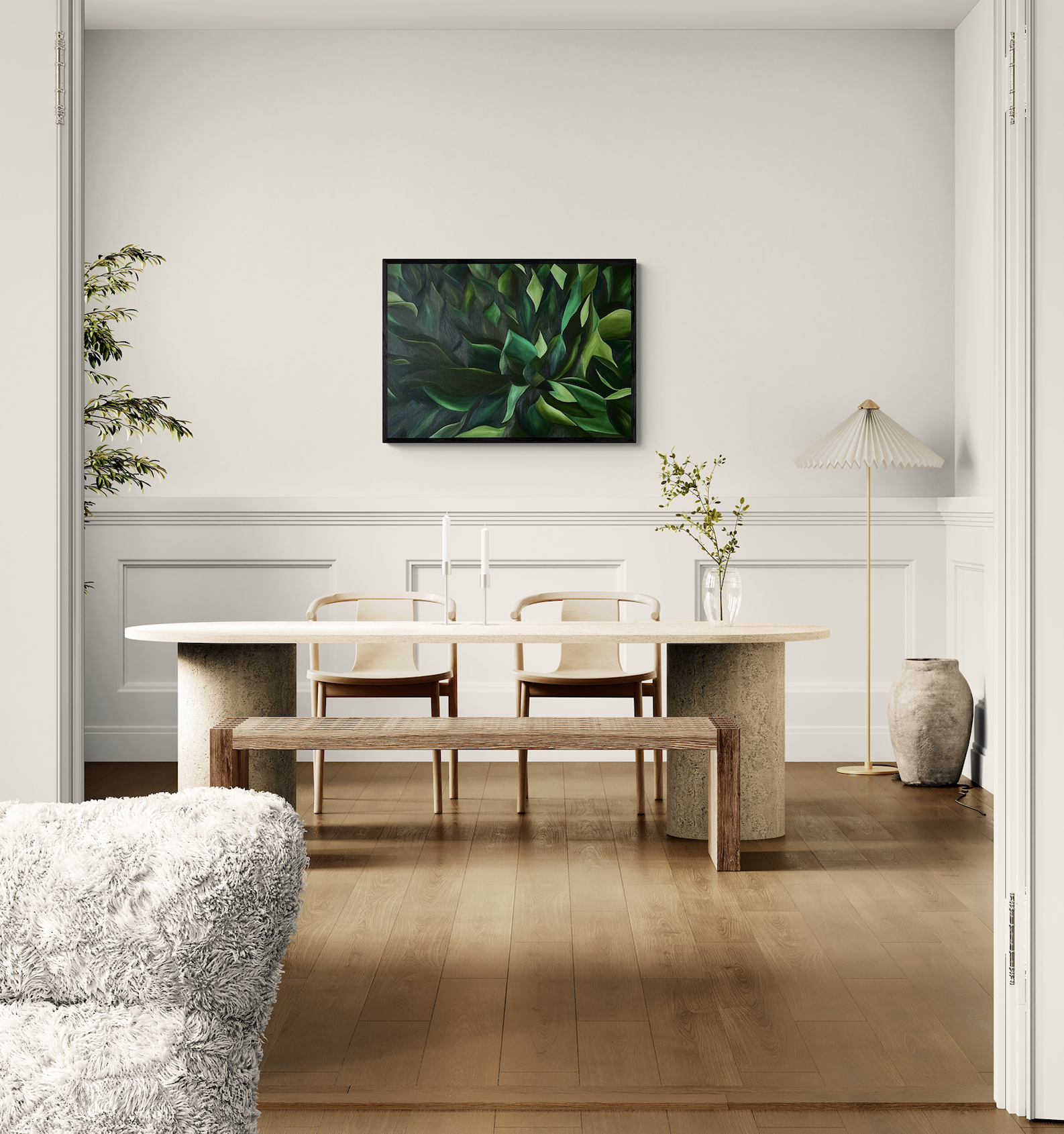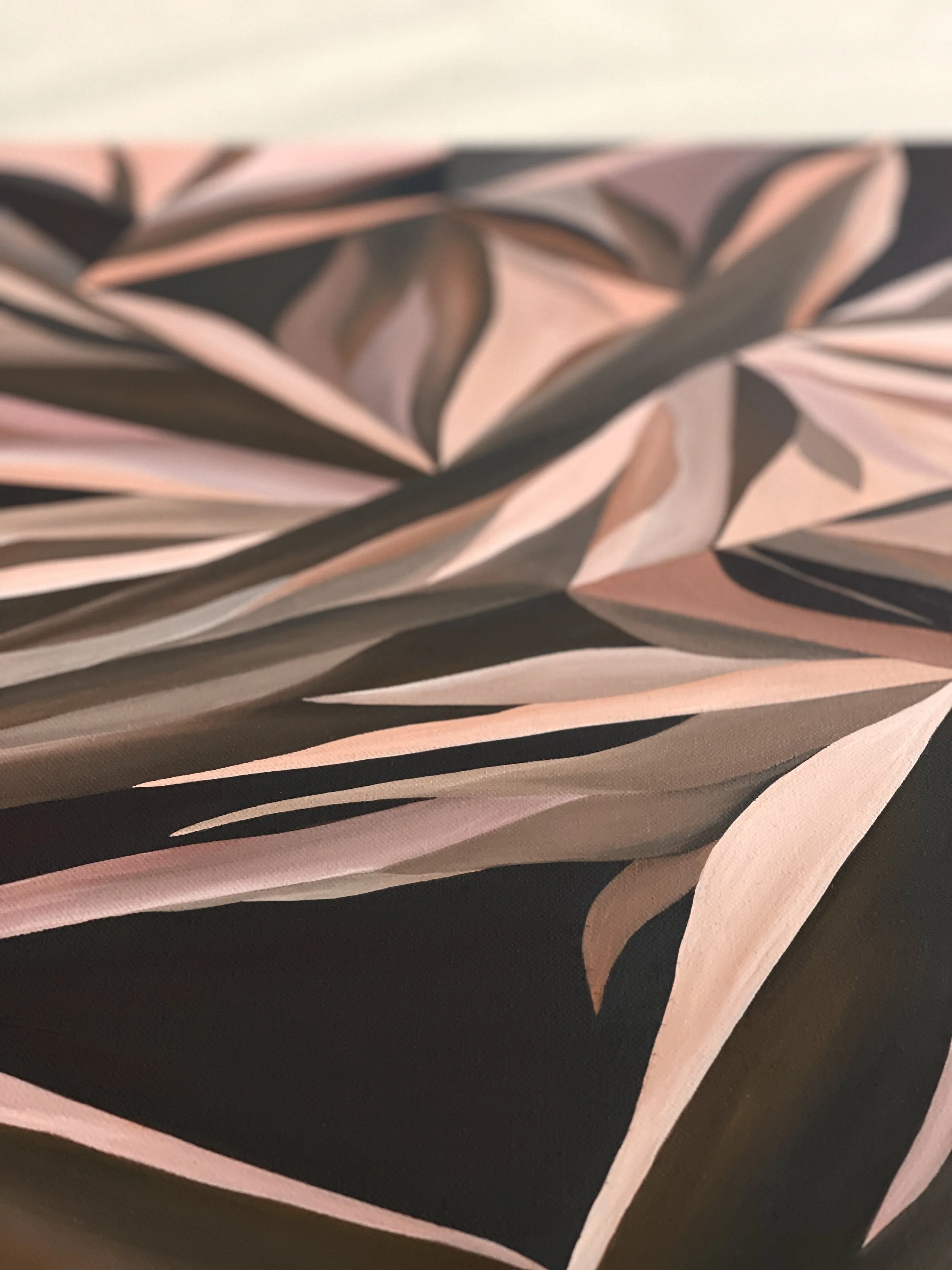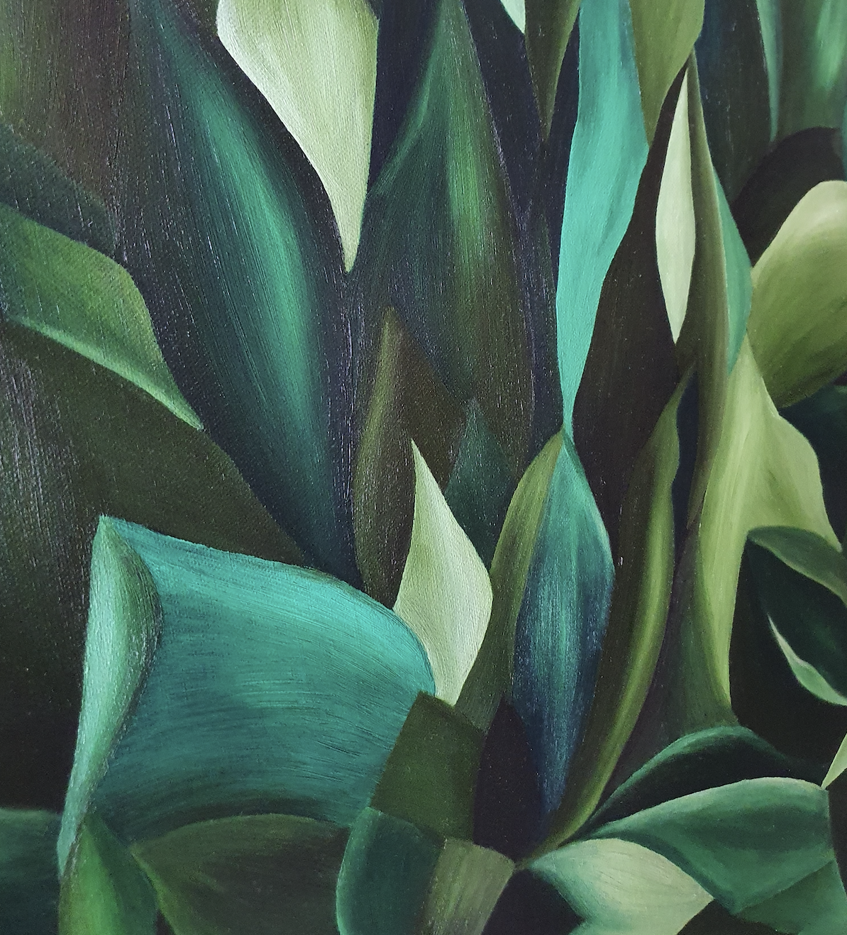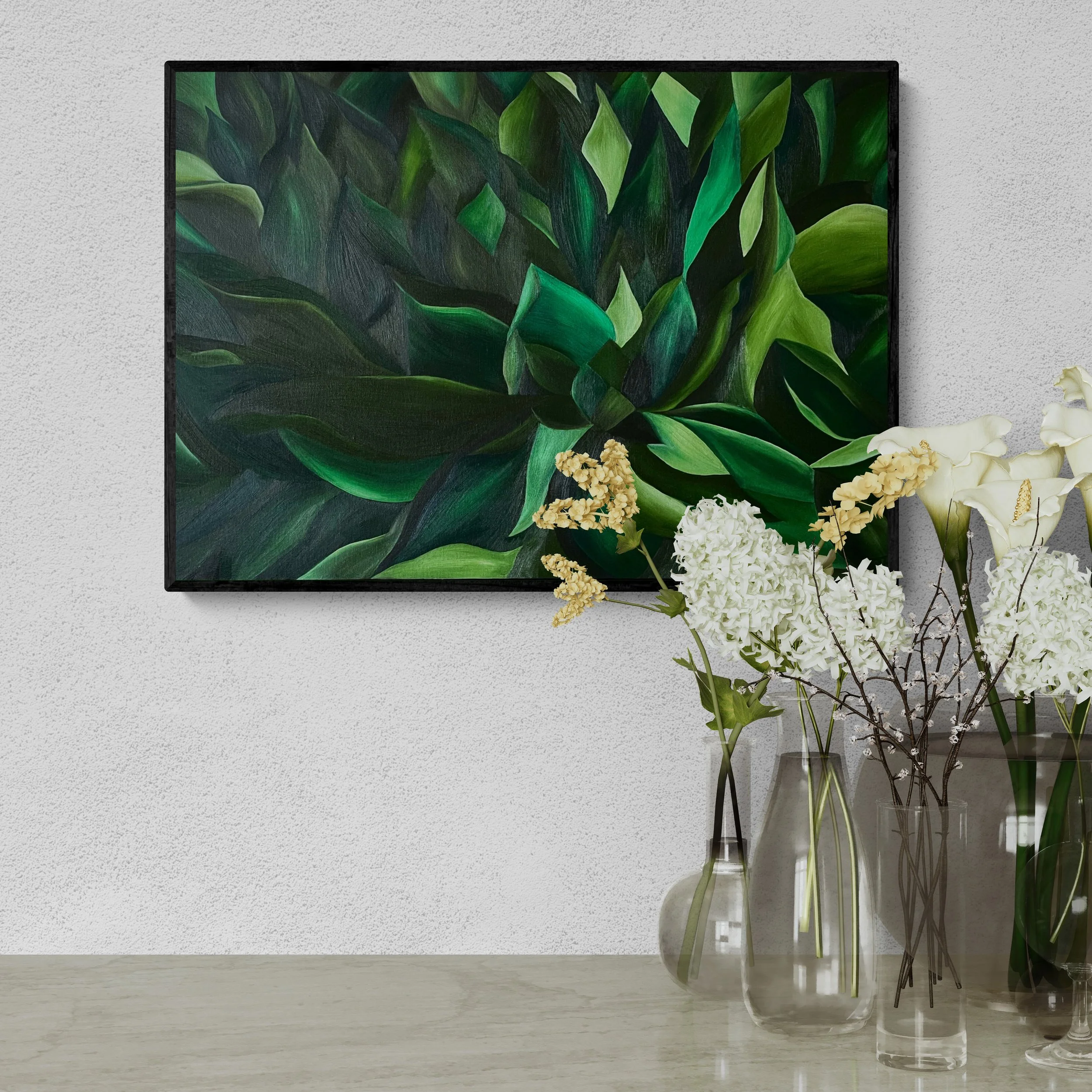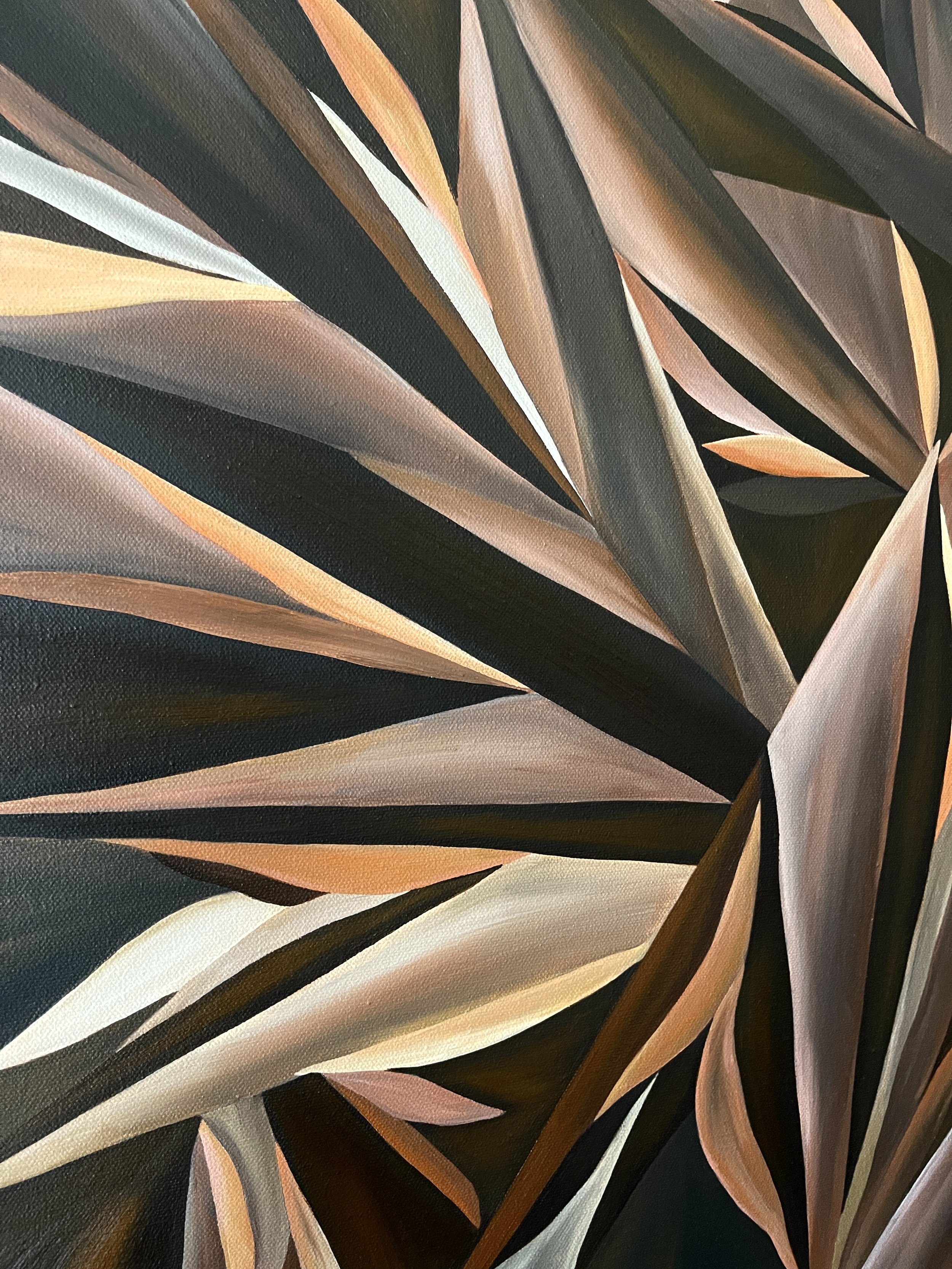 Working primarily in oils, she builds layered compositions where botanical elements unfold against circles, grids, arcs, and subtle geometric patterns. This signature fusion of florals and geometry creates a modern, recognisable aesthetic that appeals to collectors, interior designers, and contemporary art lovers seeking pieces that bring both life and structure into a space.